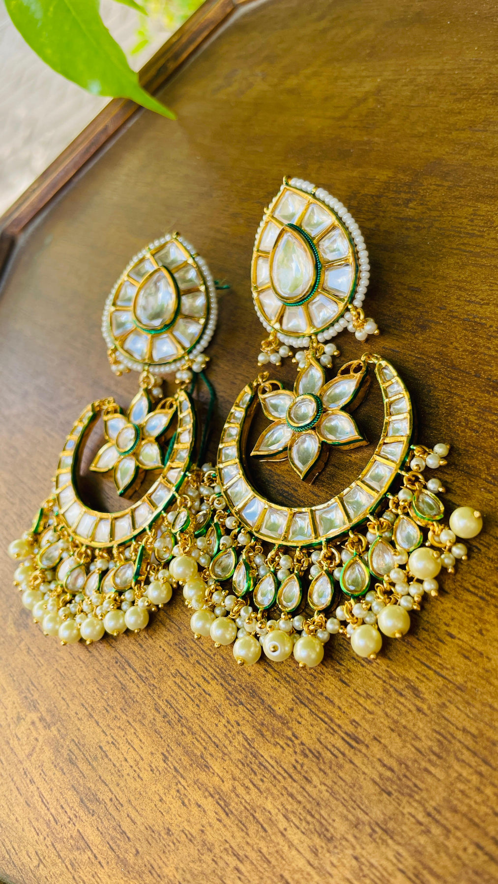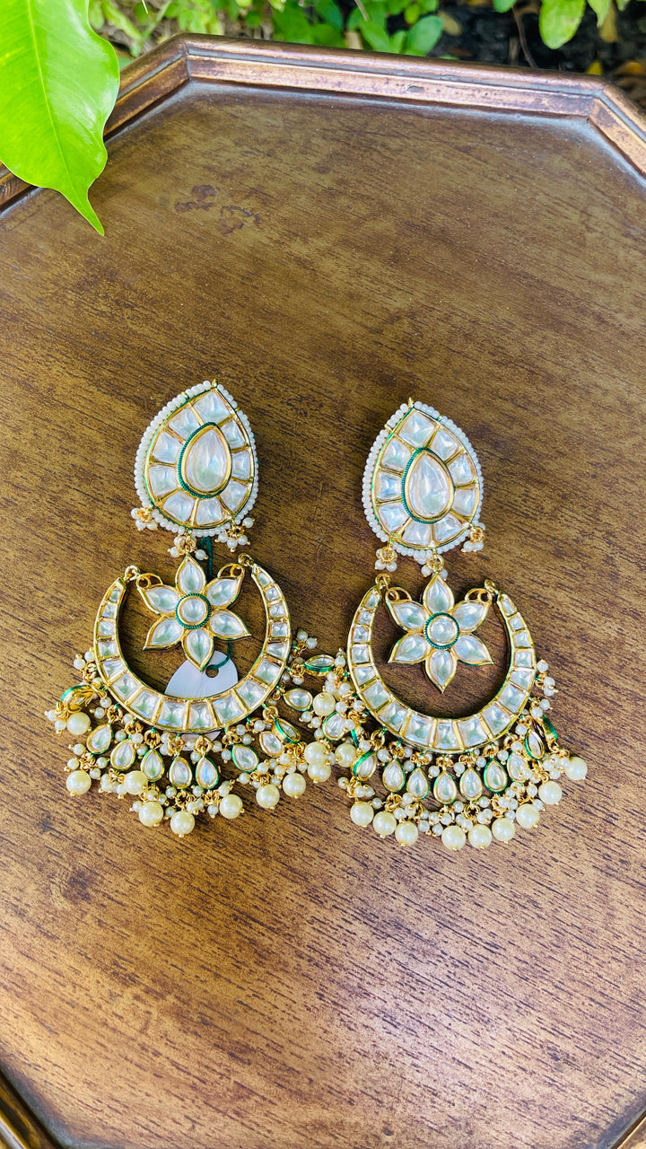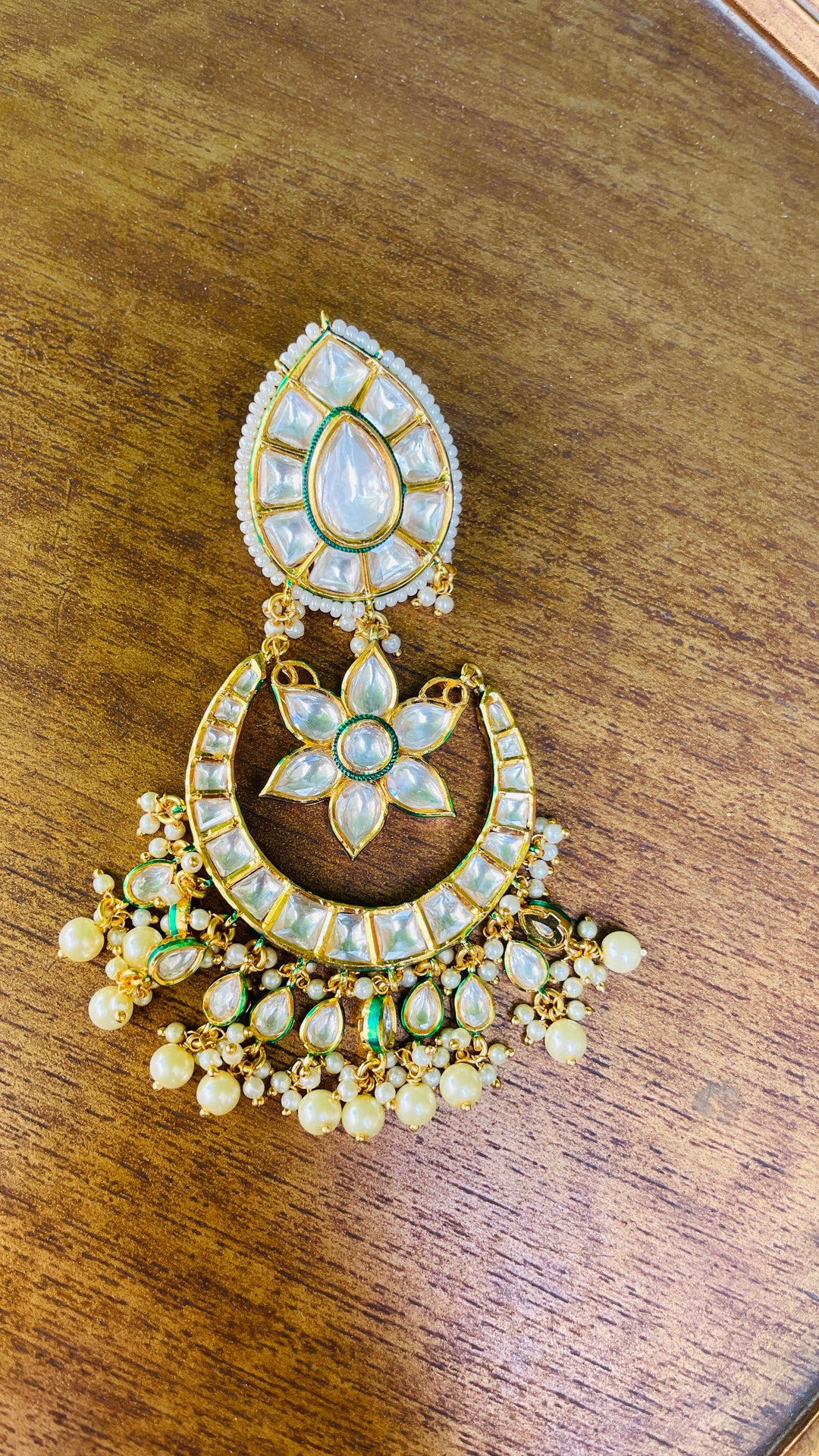 Our Gold Chandbali with white Pearl Drops earrings are stunning statement kundan style destination large earrings with pearl beads adding to its glamour. Ideal for weddings, gala dinners and parties.Earring traditional gold framework, giving a royal and vintage charm.A striking white stone in the middle, adding a touch of regal elegance Providing a bold contrast and enhancing the richness of the design. Traditional handcrafted gold-plated base, often detailed with intricate kundan or filigree work.