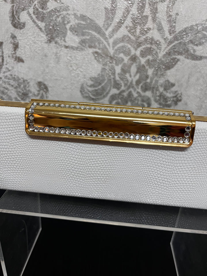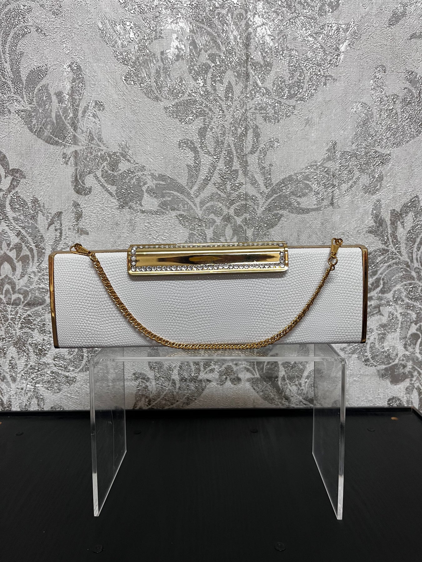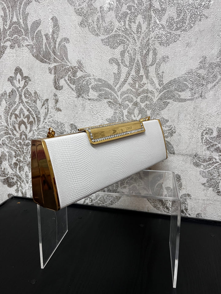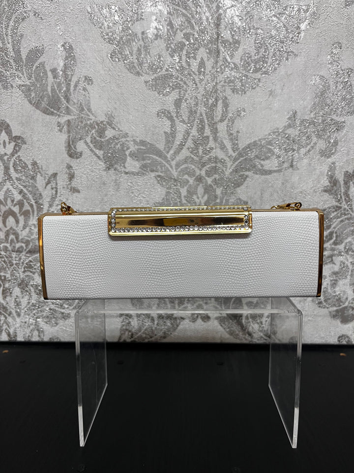 This elegant white faux leather and metal clutch purse is elegant and easy to pair with most outfits.