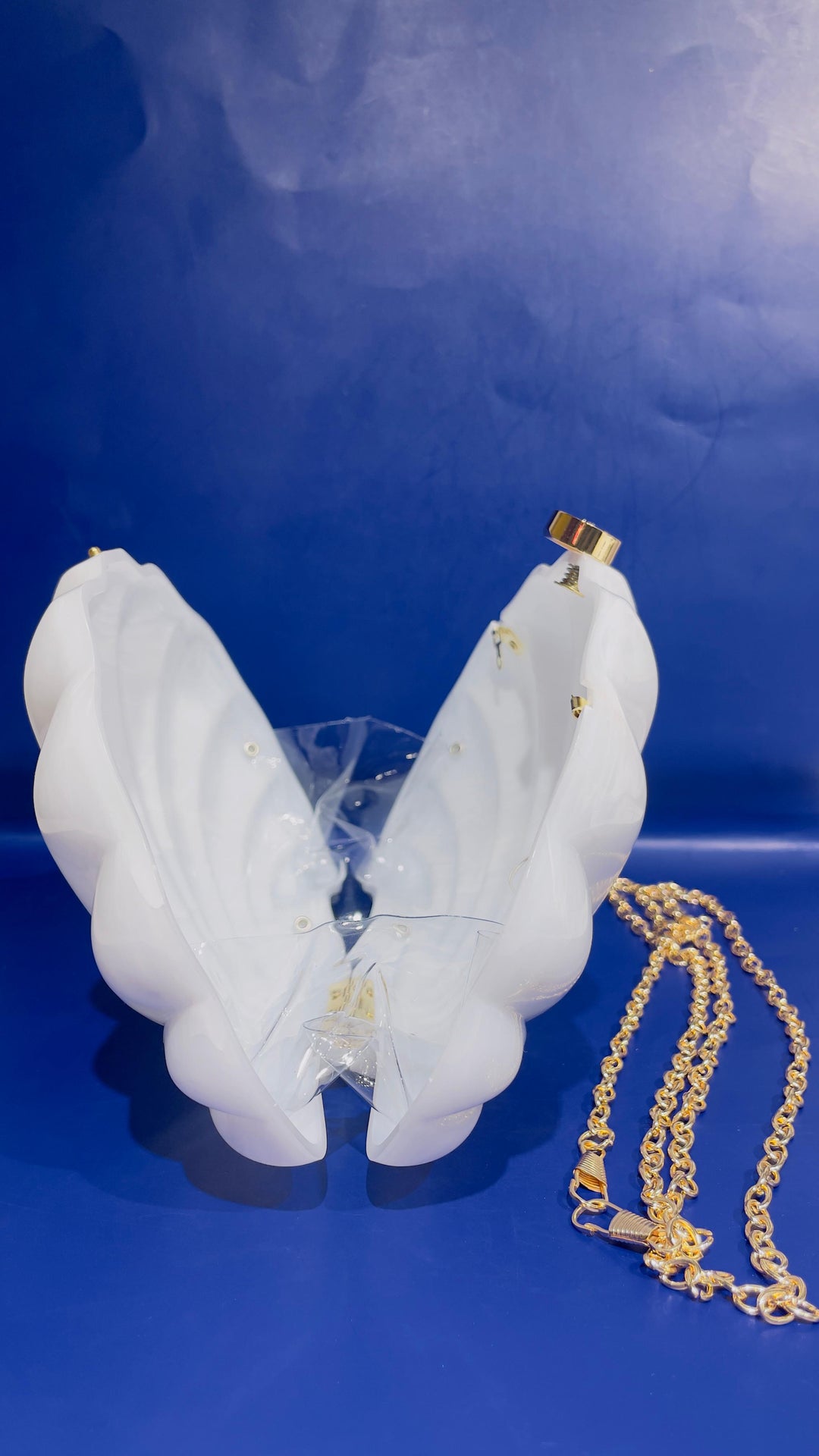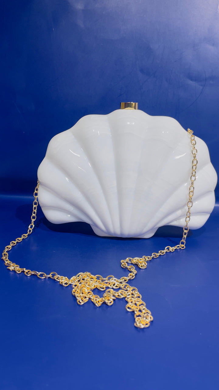 Made of acrylic, this shiny elegant shell shaped clutch purse pairs perfectly for weddings, prom, party and even ladies night outs. It adds femininity to any look. An elegant addition to your accessories arsenal. The purse also comes with gold chain. This gives you the option to style the purse as a handbag too.